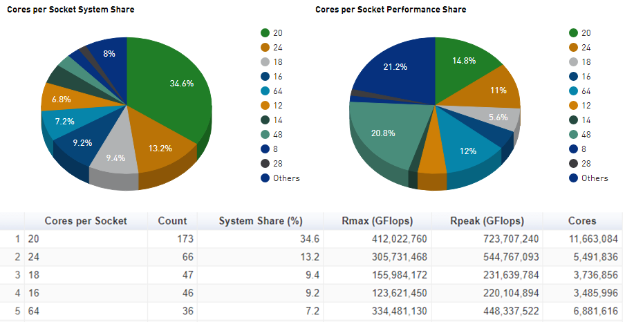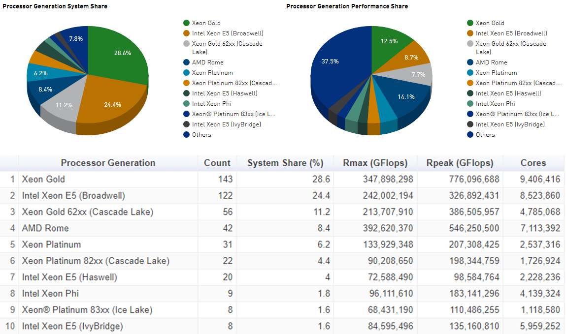 거의 다 Intel Xeon이고, AMD Rome이 4위에 있다. 프로그램을 개발하는 사람의 입장에서는 가격에 맞춰서 최신 제품을 사기 때문에 자세히 알 필요는 없다. 하지만 클러스터를 구성할 때 계산 노드(node)를 예산이 될 때마다 구입해서 추가하기 때문에 현재 구성된 클러스터의 CPU 프로세서의 성능이 어느 정도이고, 추가할 CPU 프로세서의 성능은 지금보다 얼마나 더 좋아지는지 가늠할 수 있으면 좋다. 오랫동안 클러스터를 운영하다 보면 코어 수는 같아도 CPU 성능 때문에 계산 속도 차이가 꽤 많이 날 수 있기 때문이다.