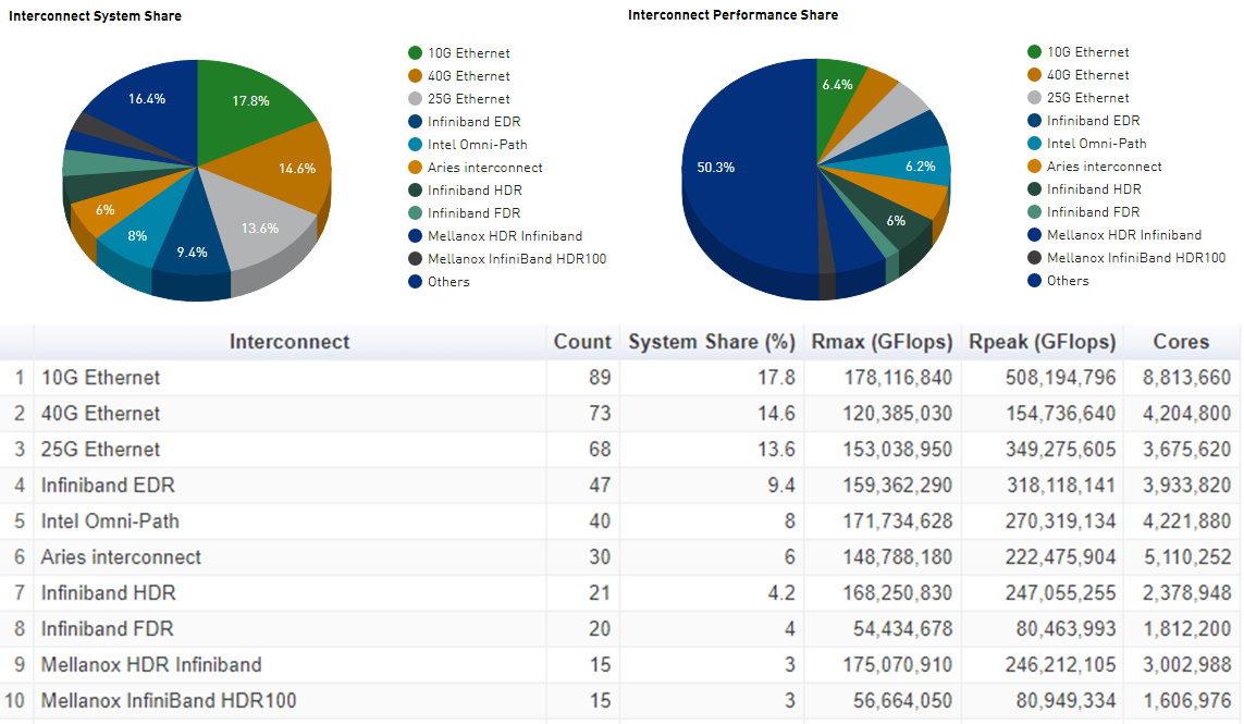 역시 아직 Ethernet이 압도적으로 많이 차지하고 있고, 10G가 가장 많다. 25G와 40G도 10G만큼 시장에 많이 공급된 것으로 보아 몇 년 뒤면 10G도 느린 인터넷이 될 것으로 보인다. 그리고 나머지는 최근들어 공급되고 있는 Infiniband가 대부분이고, 속도가 가장 빠른 Infiniband EDR(Extanded Data Rate)이 가장 많이 공급되었다.