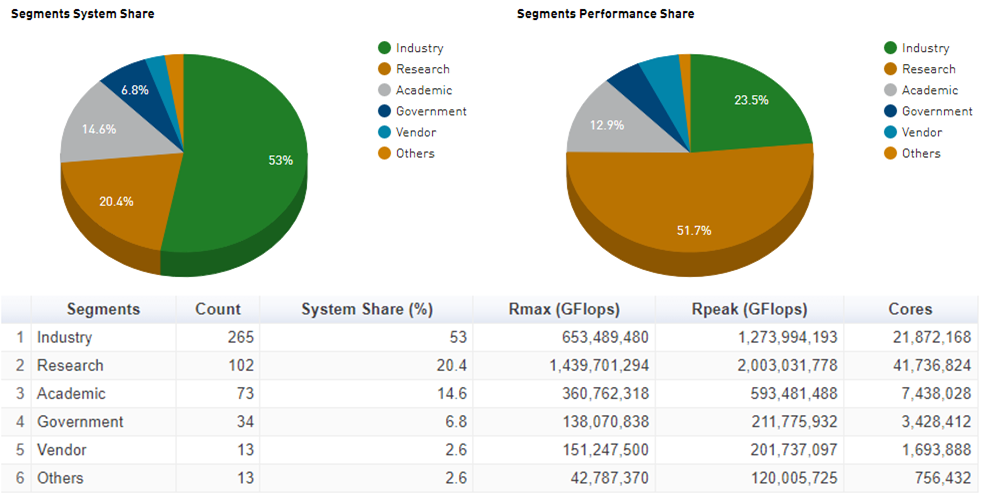 당연히 많은 연구기관에서 슈퍼컴퓨터를 보유하고 있고, 약 20% 정도된다. 차지하는 비중은 생각보다 작긴 하지만, 성능에서는 기업들이 보유한 슈퍼컴퓨터에 2배가 넘는다. - 학교(Academic)